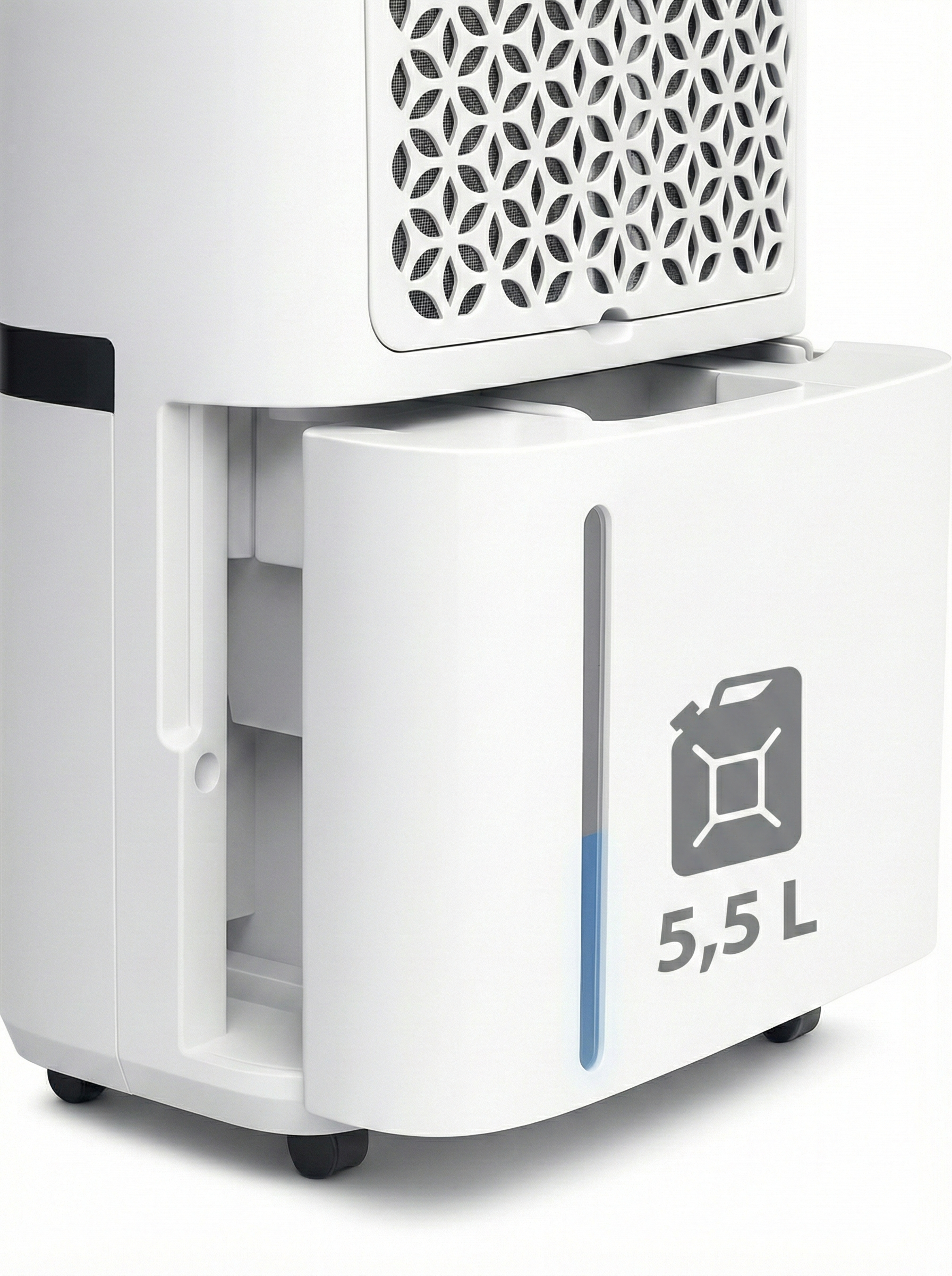 Enormer 5,5l-Tank mit Sichtfenster für weniger Leerungen oder Non-Stop-Betrieb via Ablaufschlauch.